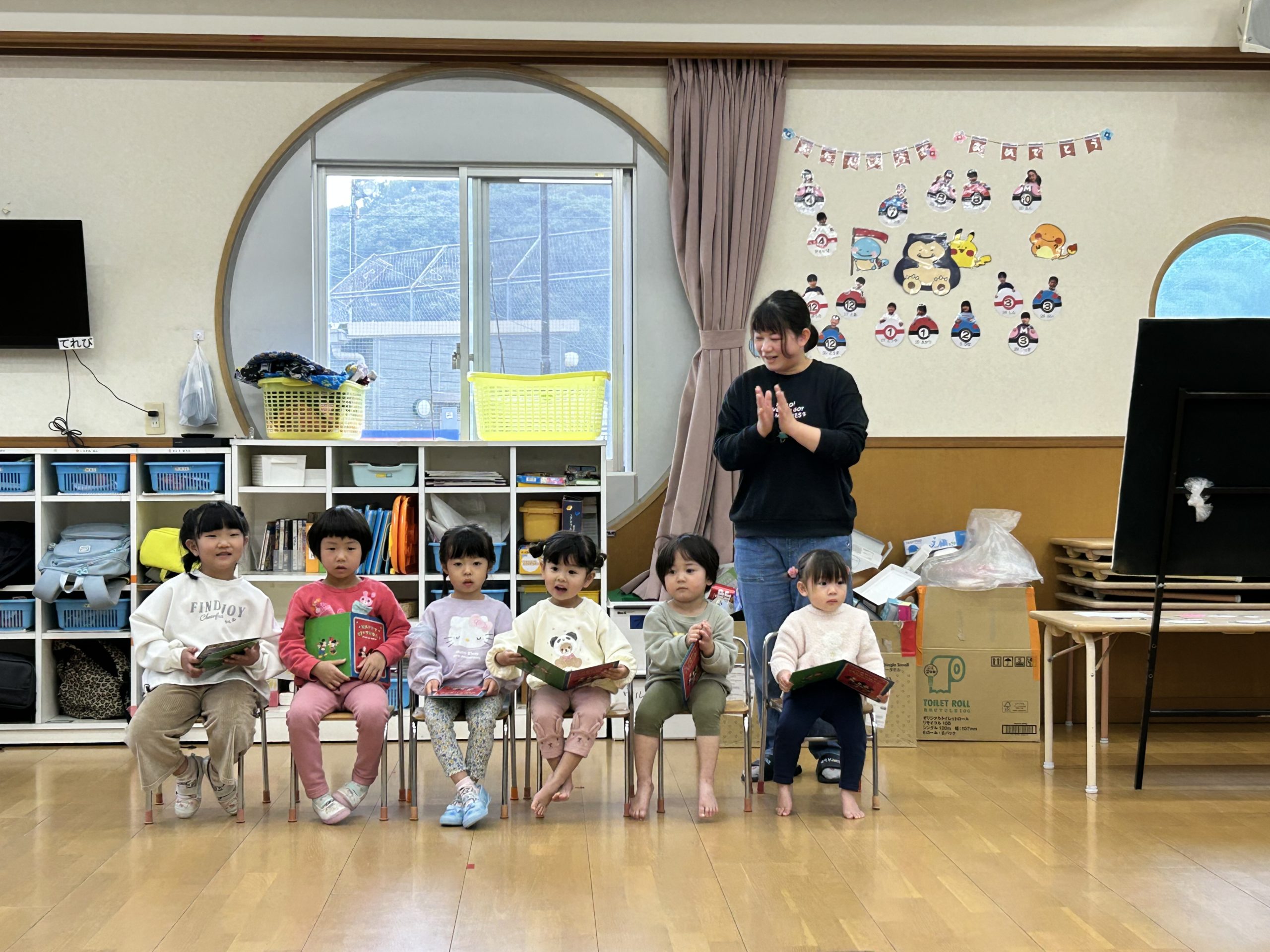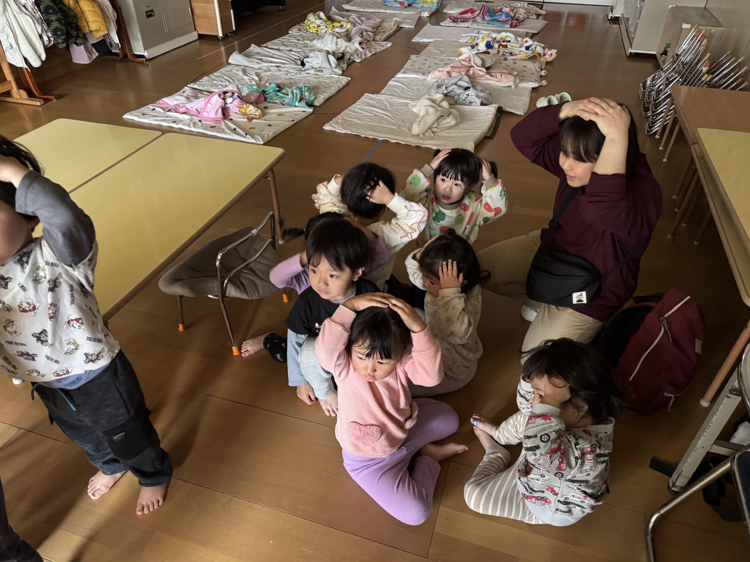 今回は、午睡中に地震と津波が発生した想定で避難訓練を行いました。ぐっすり眠っている子たちを起こして、各クラスで集まりましたが、泣く子がほとんどいませんでした。その後、濃霞山へ避難。年長さんは防災リュックを背負って避難しました。
