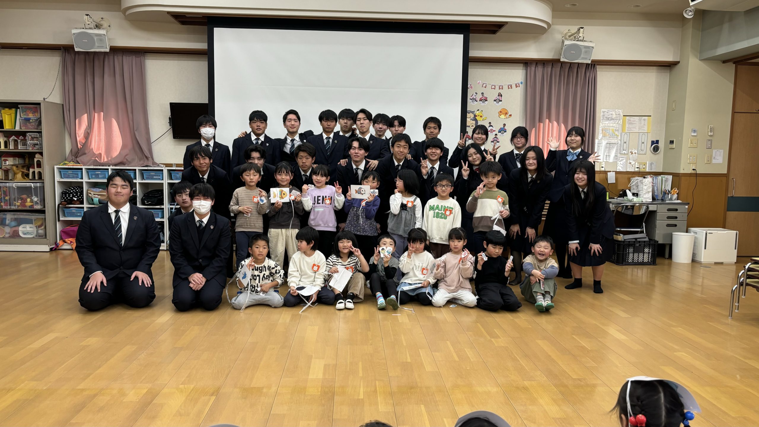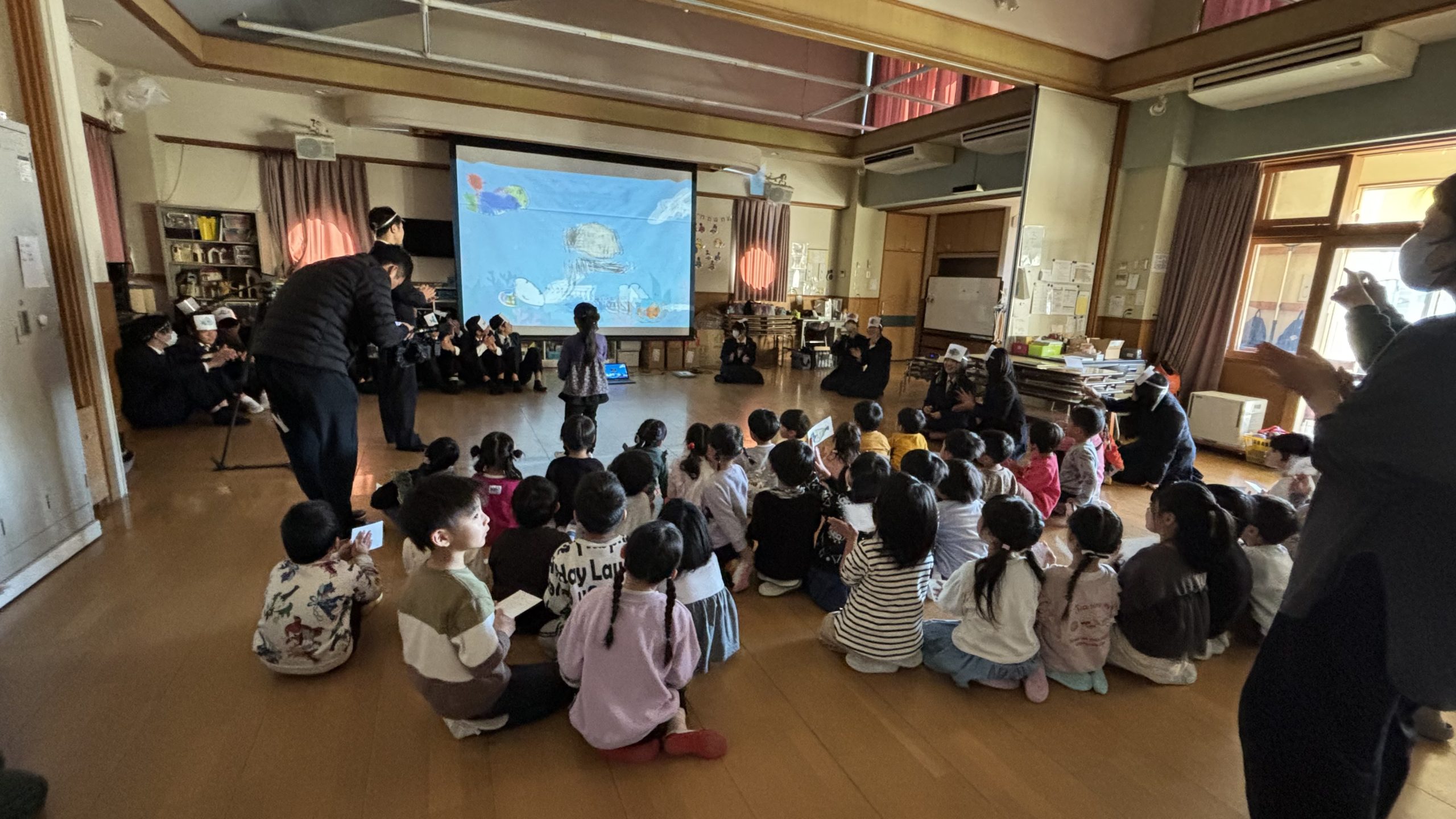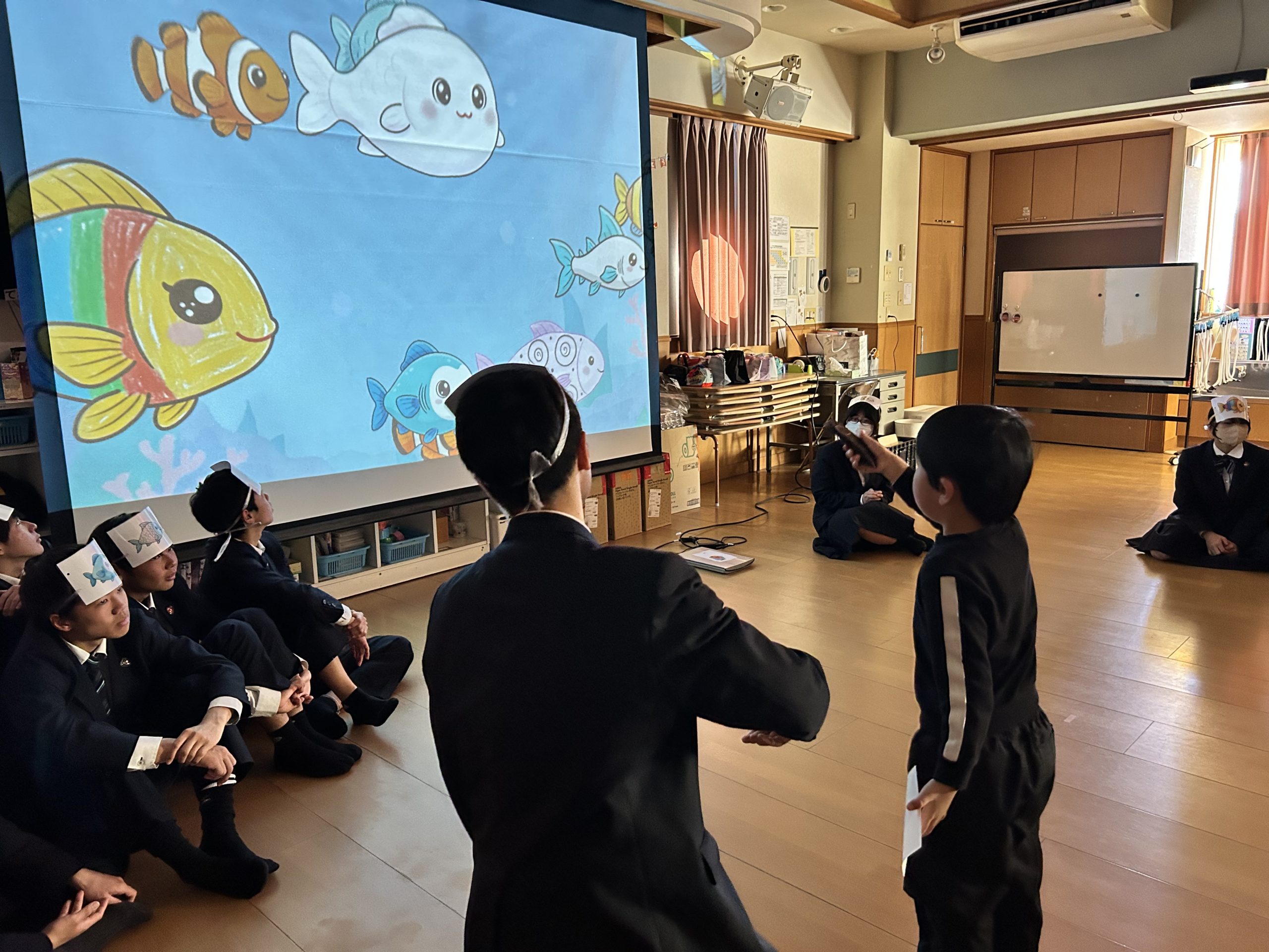 HOME NBU水族館 2026年1月14日 NBU水族館 NBUの学生さんが来園し、NBU水族館を披露してくれました。 こどもたちが描いた魚の絵をスイライド画面に映し、リモコンを振ると海で泳いでいるように見えたり、魚の絵をAIで可愛いイラストに変えてくれたり、スライドを見ながら楽しむことができました。自分の絵が出てくると、「僕の!」「私のもあるー!」など、喜んでいましたよ。 最後に皆で「おさかな天国」のダンスを踊り、学生さん手作りのおさかなキーホルダーをプレゼントしてもらいました。 初めての行事でしたが、ワクワクしながら参加でき、こどもたちも楽しめたようです。 前の記事 次の記事
