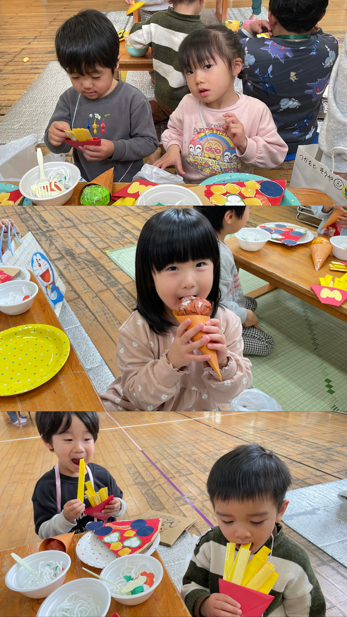 給食とおやつは、うどんとピザとポテトを食べました🎵