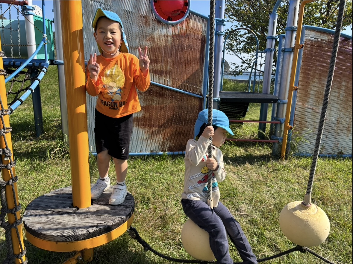 0.1歳児はひばり公園、2.3歳児はちどり公園へ。そして、4.5歳児は電車に乗って、つくしんぼ人形劇としおさいの里公園へ行って来ました。