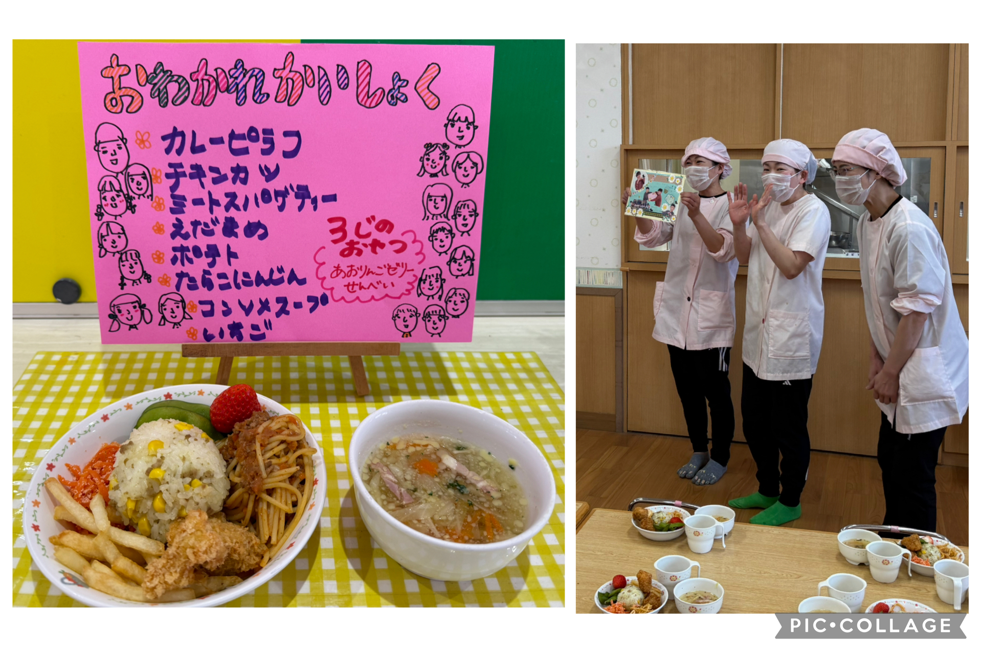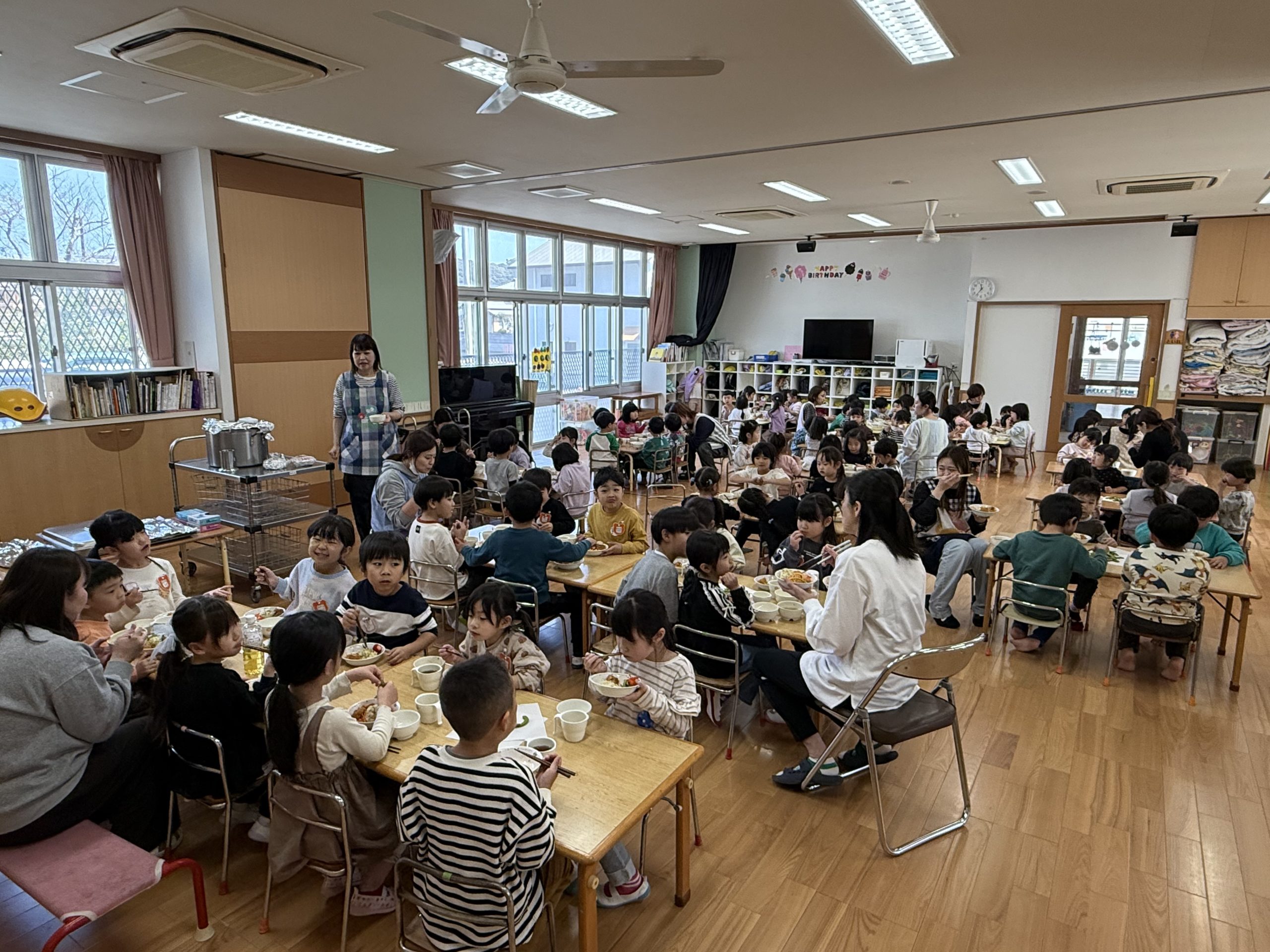 昨日はお別れ会食の日で、みんなでご飯を食べました。5歳児クラスからは「おいしい給食を作ってくれてありがとう!!」と、給食の先生へメッセージカードをプレゼントしました。みんなで食べるごちそうに、とても嬉しそうな子どもたちでした。
