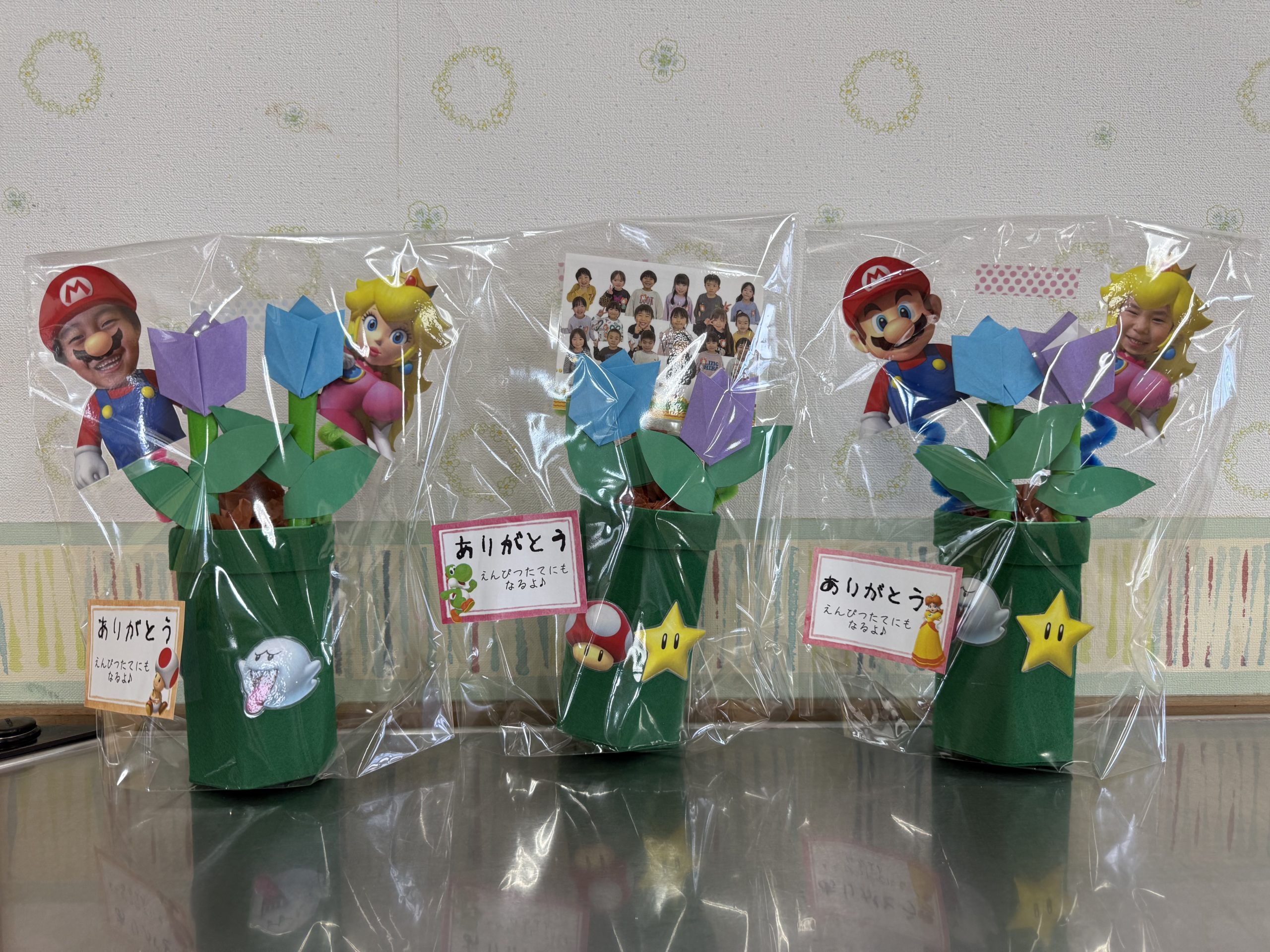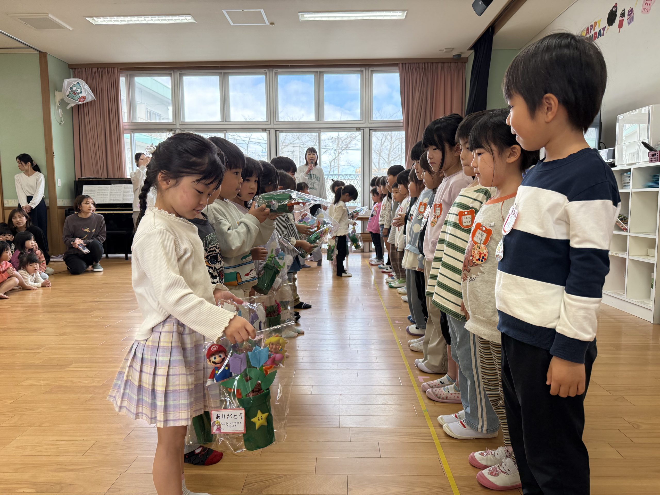 そして、今日は3月のお誕生会の後に5歳児のお友達とのお別れ会がありました。4歳児からは手作りで、マリオの鉛筆たてを一人一人にプレゼンをしました。そして、異動する先生や退職する先生の挨拶もあり、「どこにいくの?」と不思議そうにしている子どもたちもいました。