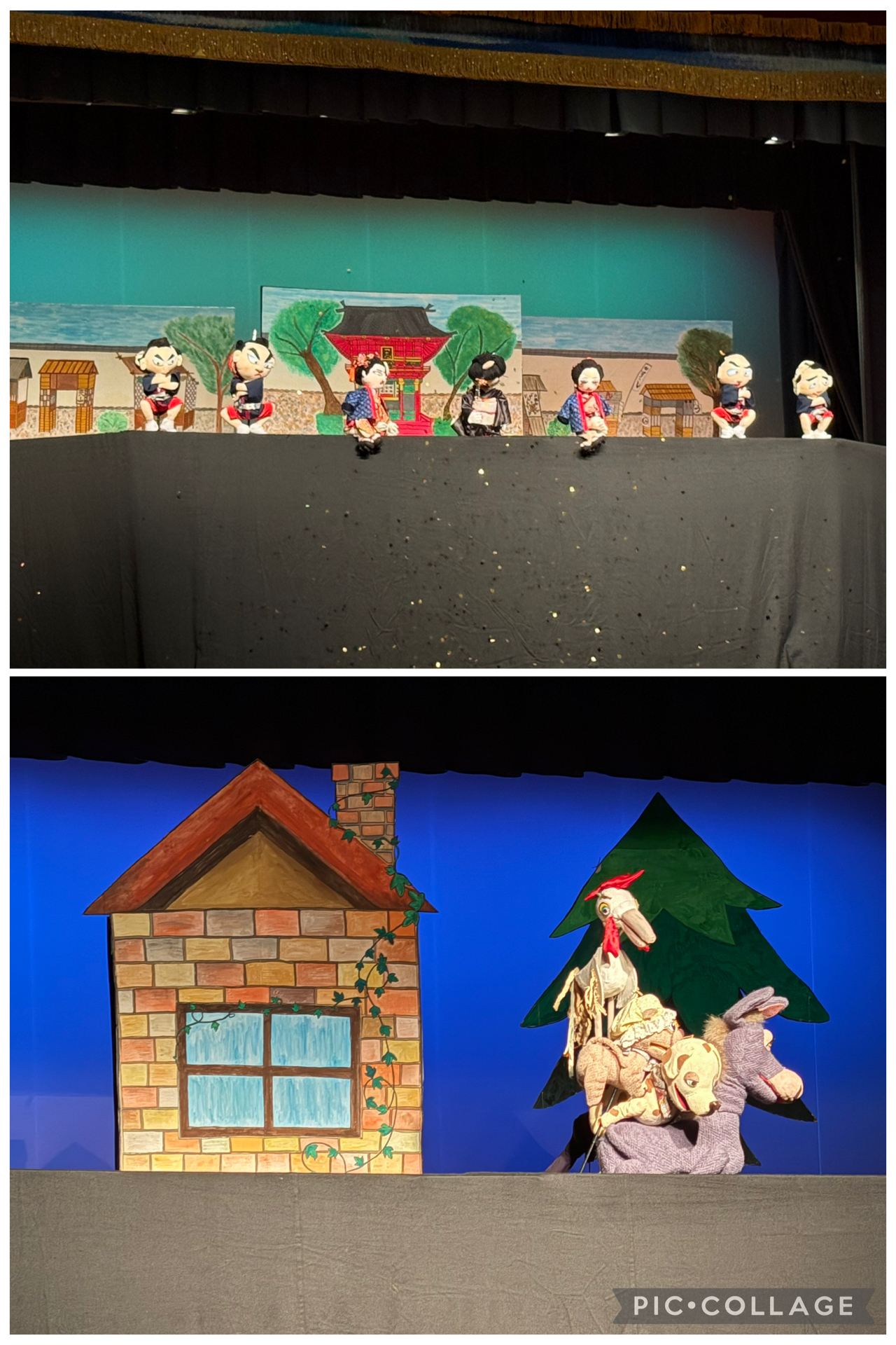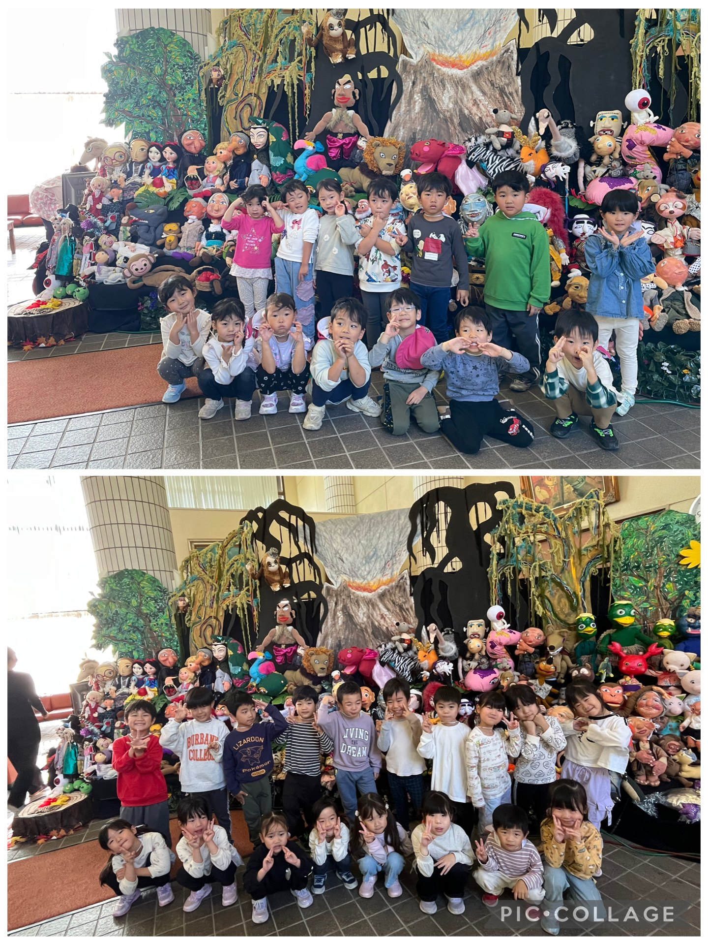 今日は秋の遠足で、4・5歳児クラスで、八幡保育園のお友達と交流会もかねて、つくしんぼ人形劇に、電車に乗って行ってきました。人形劇の話では「ブレーメンの音楽隊」と、知っているお話もあり、劇団員さんとお話しの中でのやり取りや、音楽に合わせてリズム遊びをしたり、とても楽しそうに見ていました。